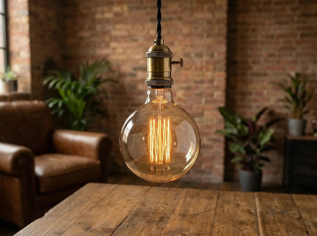 Le verre ambré filtre légèrement la lumière pour lui donner cette teinte orangée nostalgique. Bien que la puissance soit de 60W, le rendu est plus doux et moins éblouissant qu'une ampoule claire, privilégiant l'ambiance à la puissance d'éclairage pure.